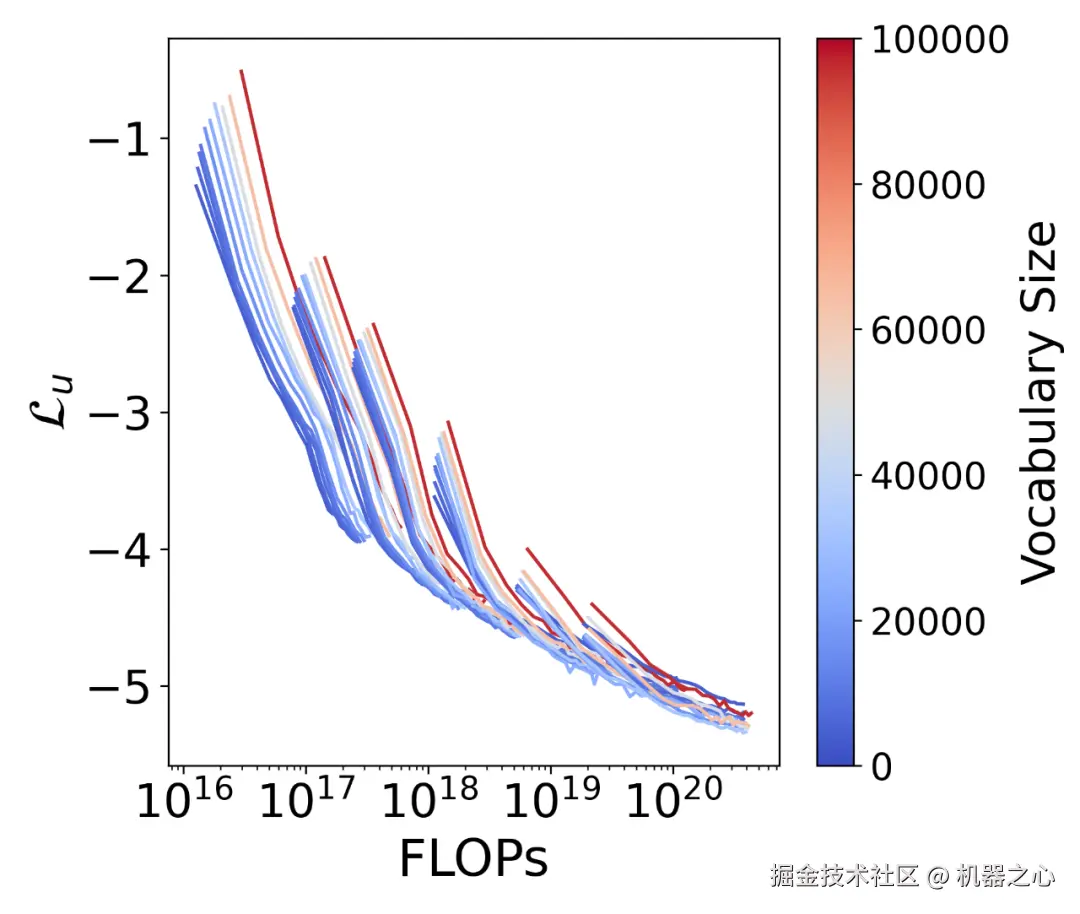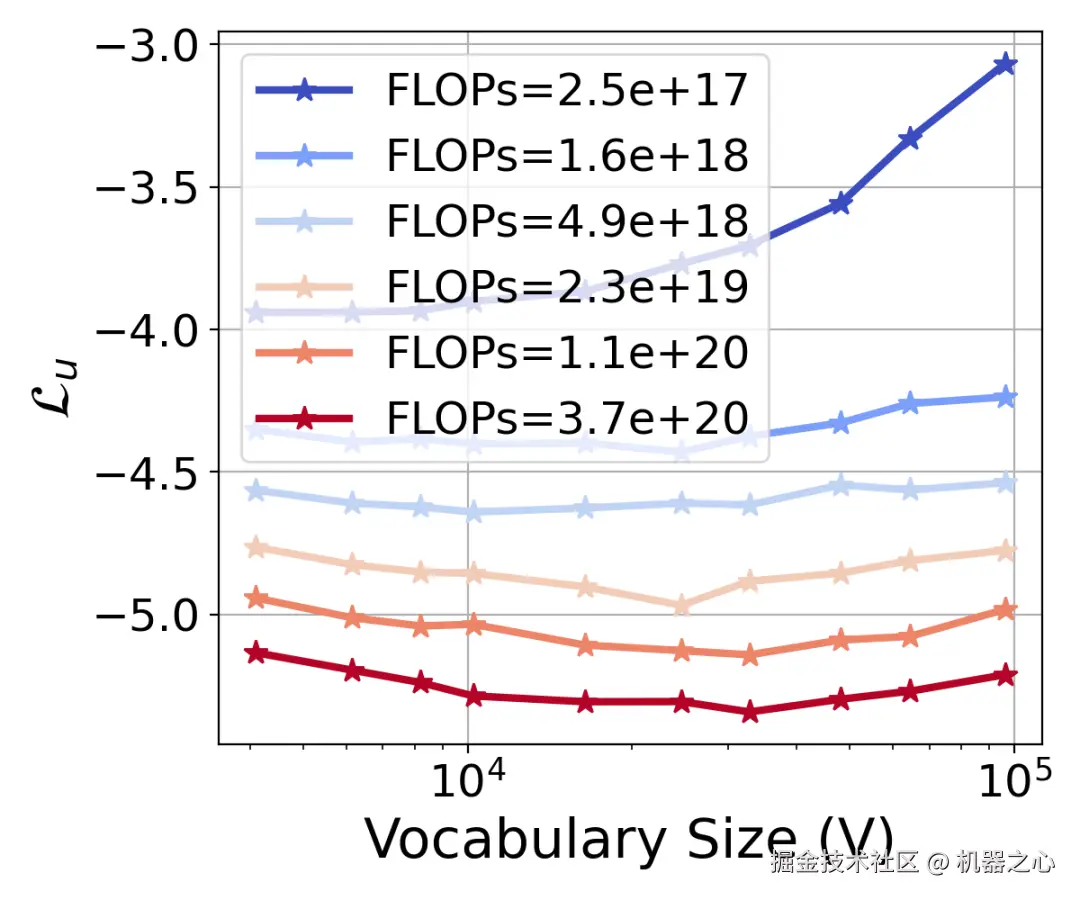 图上是在不同 FLOP 预算下,不同词表大小的损失曲线。对于每个预算,都存在一个最小化损失的最优词表大小。并且随着 FLOPs 预算的增加,这个最优词表大小也会增加(向右移动)。