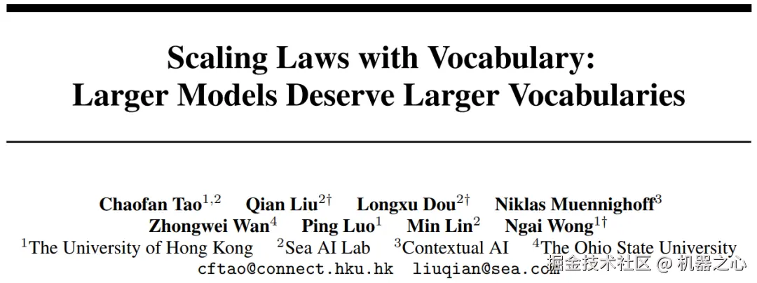 本文是一篇发表在 NeurIPS 2024 上的论文,单位是香港大学、Sea AI Lab、Contextual AI 和俄亥俄州立大学。论文主要探讨了大型语言模型(LLMs)的词表大小对模型性能的影响。