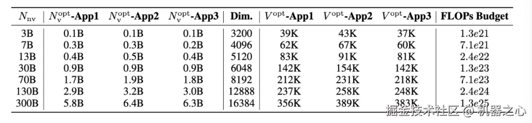 在这一节中,本文报告了基于三种方法预测的最优词表参数和大小,遵从以前的关于 scaling laws 中数据量和模型参数的算力分配有关工作 [1],训练数据的量与非词表参数等比例地随 FLOPs 预算缩放。