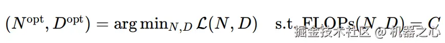 扩展法则 (scaling laws) 考虑了一个计算预算(以 FLOPs 衡量),目标是在模型参数 N 和训数据量 D 之间最优地分配这个算力的预算: