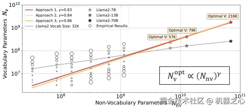 通过收集不同非词表参数、词表大小和训练数据量的实验点,并使用这些点来拟合上述损失函数的参数,我们拟合出这个有有关的损失函数