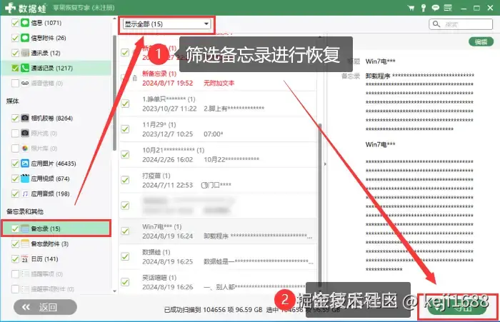 步骤2:等待扫描完成后,可以自由筛选您需要的备忘录进行恢复,恢复后导出至电脑的安全位置进行保存即可。