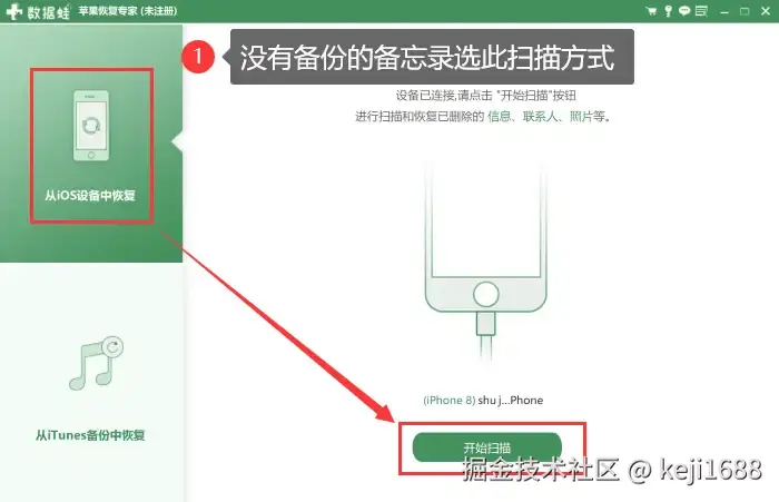步骤1:在电脑上启动苹果恢复专家,将手机与电脑连接到一起后,选择正确的扫描方式并点击 【开始扫描】 按钮。