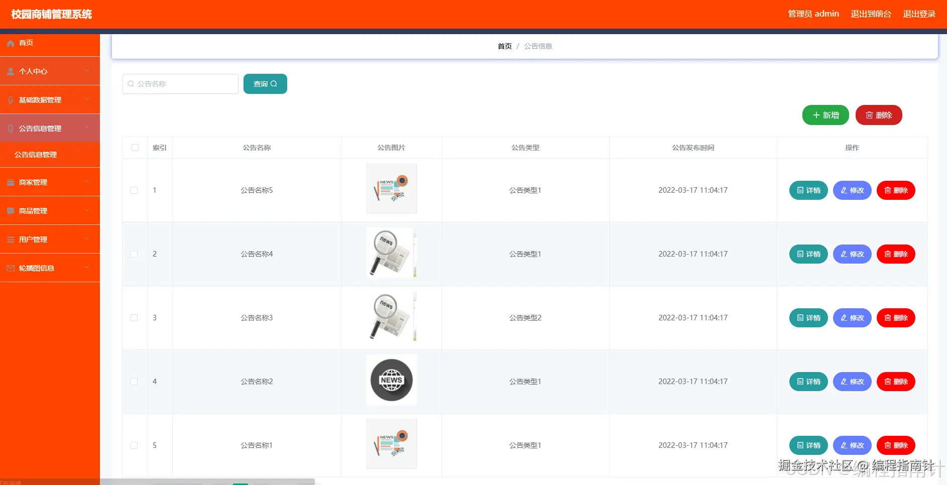 公告信息管理页面提供的功能操作有:新增公告,修改公告,删除公告操作。下图就是公告信息管理页面。