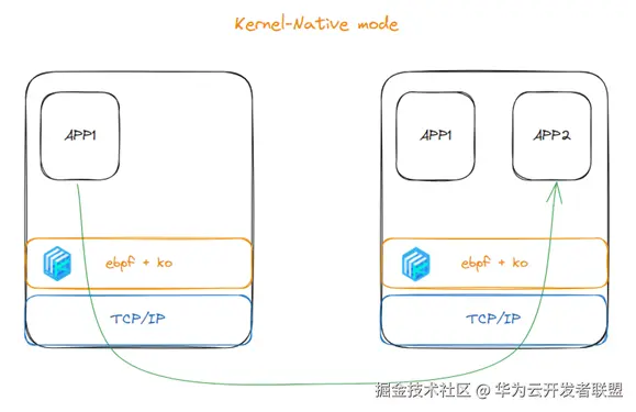 对于“Kernel-Native”模式,由于 eBPF 技术非常适合四层流量治理,并且结合可编程内核模块,可以实现七层流量编排。Kmesh 最初完全依赖 eBPF 和内核模块来实现 L4-L7 的治理。Kmesh 采用随流治理策略,不会在服务通信过程中增加额外的连接跳数,与 Sidecar 模式相比,服务之间的通信连接数从三条减少至一条。“Kernel-Native”模式的架构图如下: