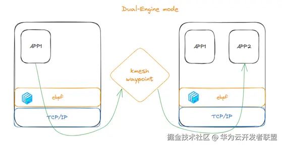 同时,为了增强七层协议的治理能力,今年 Kmesh 引入了一种新的治理模式——“Dual-Engine”模式,利用 eBPF 将流量转发到 kmesh-waypoint 进行高级的七层协议治理。这是一种更灵活的分层治理模型,能够按需满足不同用户的多样化需求。