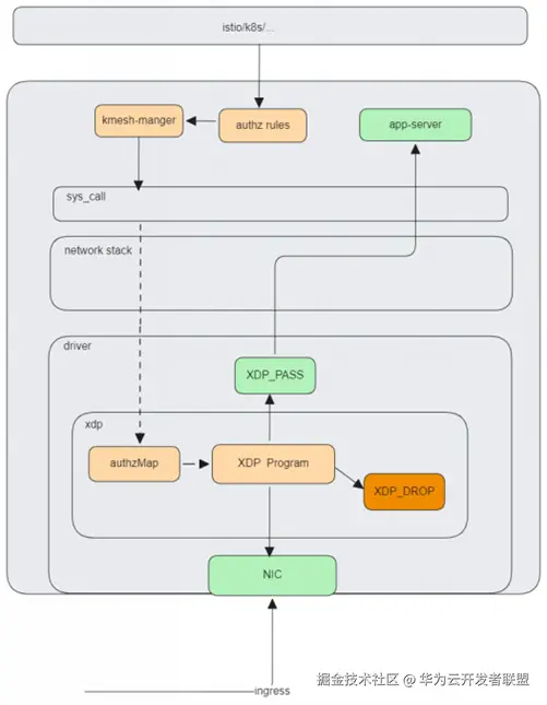 如上图所示,集群内配置的鉴权规则通过消息订阅机制,被写入 eBPF Map。Pod 上入方向的流量在建链时,会在 XDP 程序中进行鉴权规则匹配,如果鉴权结果为拒绝,则包被丢弃;如果鉴权结果为允许,则流量将通过协议栈发送到对应的 App 进程。