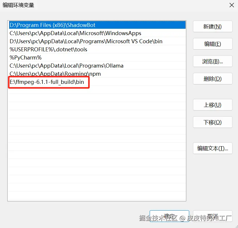 添加 ffmpeg 路径: 在弹出的“编辑环境变量”窗口中,点击“新建”,并将 ffmpeg 的 bin 文件夹路径(例如:E:\ffmpeg-6.1.1-full_build\bin)粘贴进去。请确保将路径替换为您实际安装 ffmpeg 的路径。
