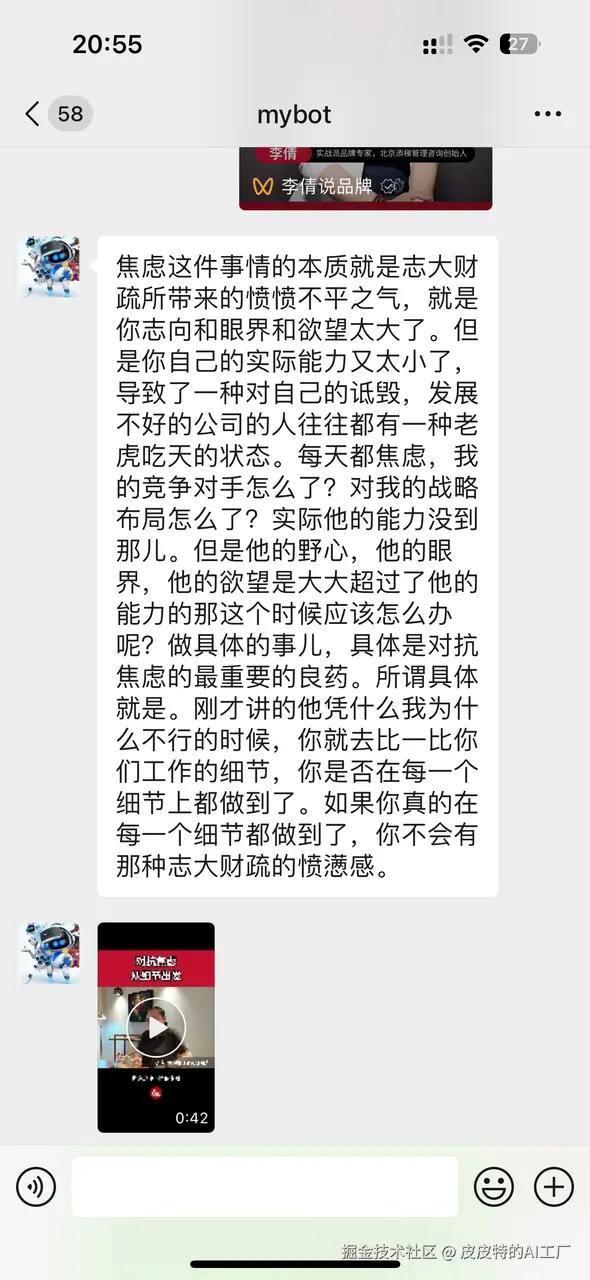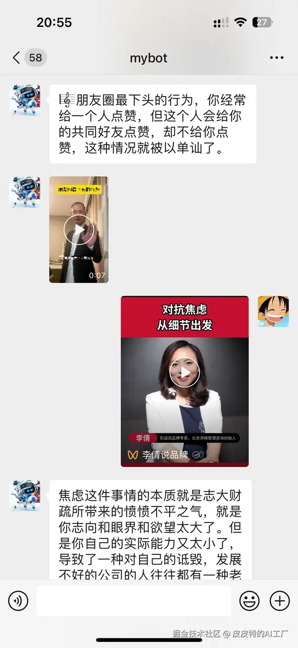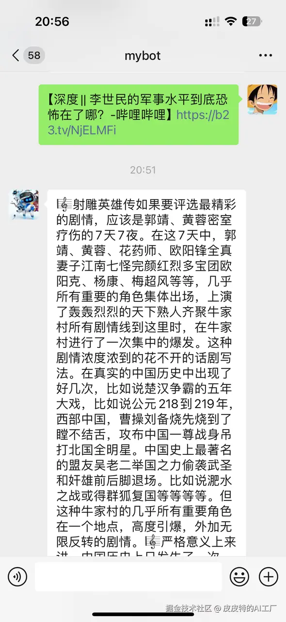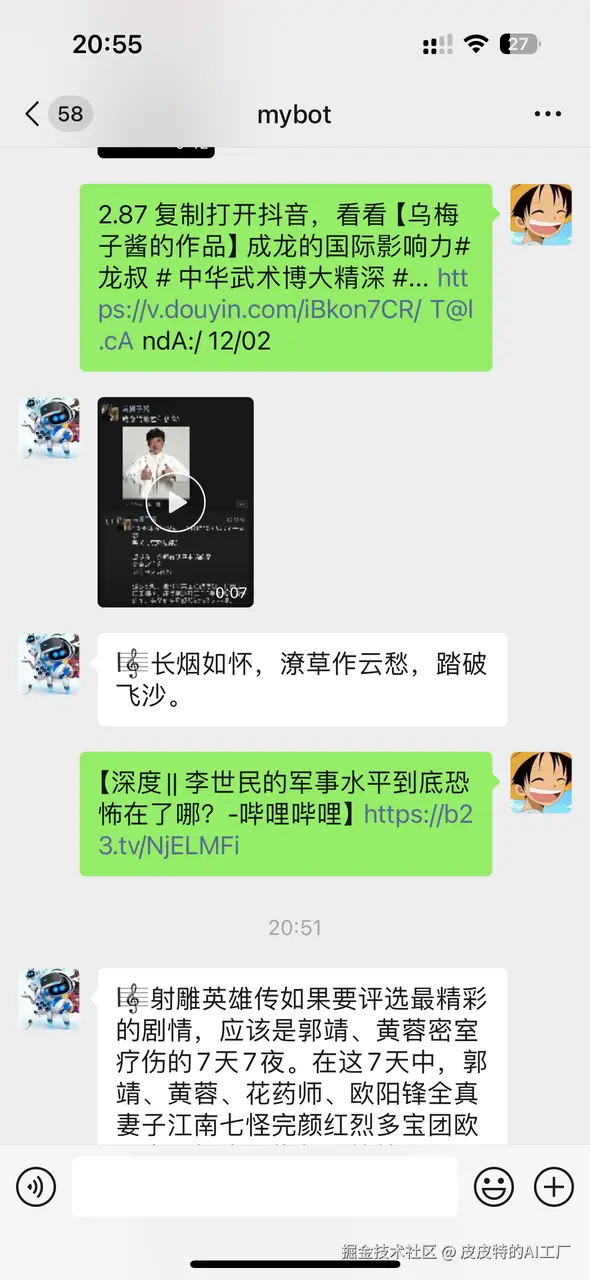 另外可能还有日常零散视频的轻量化处理需求,所以我想,干脆一不做二不休,直接在飞书和微信上做一个机器人方便自己随时使用,下面是我自己实现的效果,这里我们可以使用开源的wechatpy 或者基于hook协议去做,这块我就不展开了,github上面有许多基于wechatpy的项目,大家可以以此为关键词在github搜索一下魔改然后直接拿一个小号即可。