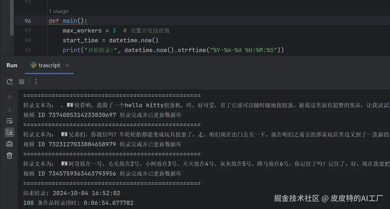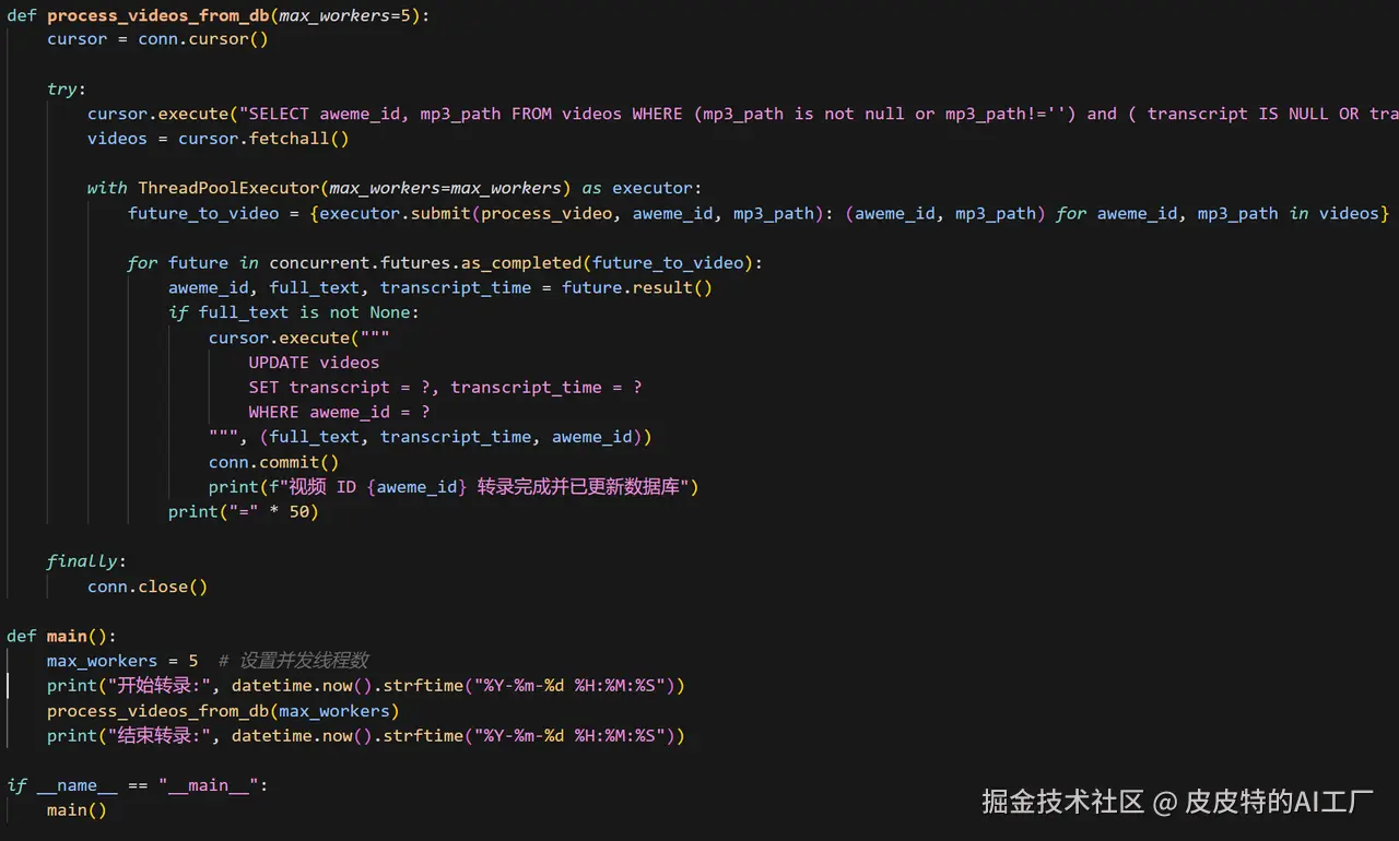 接下来就是批量解析了,我们把上一步采集到的链接放到脚本目录下,或者从自己的采集源中进行转录,比如我的数据都保存到我的数据表中作为素材库使用,这是根据自己的实际业务需求自定义逻辑即可,下面是我使用cursor写的一个脚本,首先一个后台线程批量进行视频下载,然后一个多线程前端转录,这样下载和转录相互分开,增加转录速度。