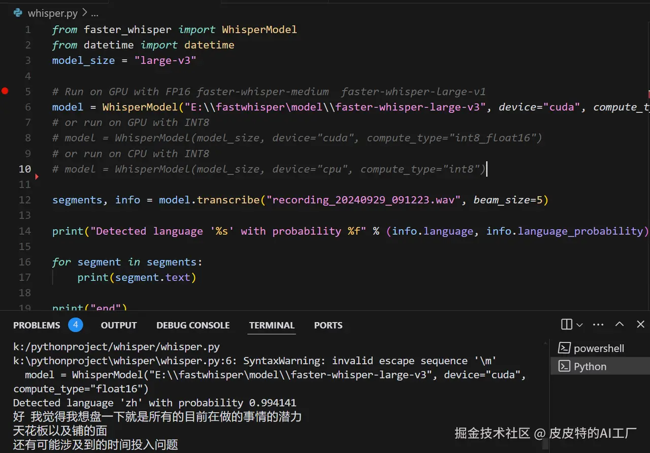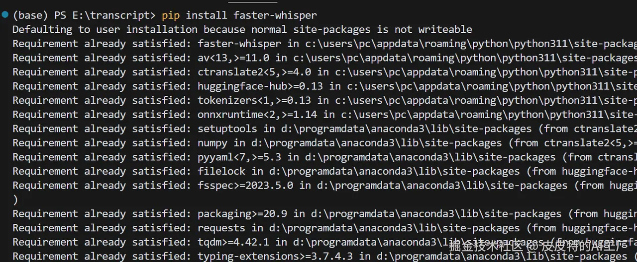 faster-whisper: 可以通过 PyPI 快速安装,首次运行时会自动下载模型文件。推荐使用