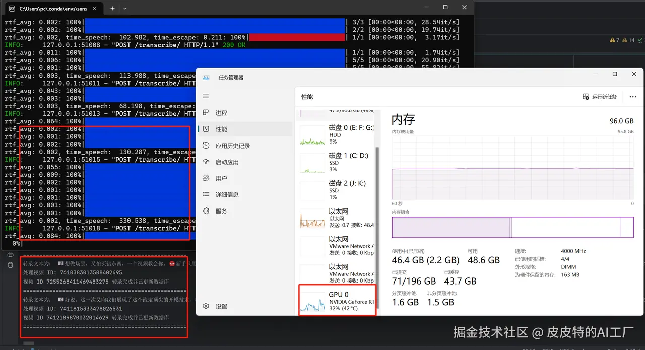 下面是5个线程批量转录的硬件占用情况,,GPU占用大概在30-60之间,总体转录效率很OK,图二是开启三个线程的情况,转录100个抖音红书和B站视频,大概花了6分多钟,这其中包括了几个3G的长达一小时的B站视频。
