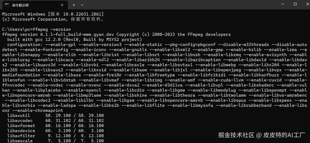 配置完成环境变量后点击确定,进行ffmpeg安装成功验证。打开命令提示符窗口。输入命令“ffmpeg –version”。如果命令提示窗口返回FFmpeg的版本信息,那么就说明安装成功了。