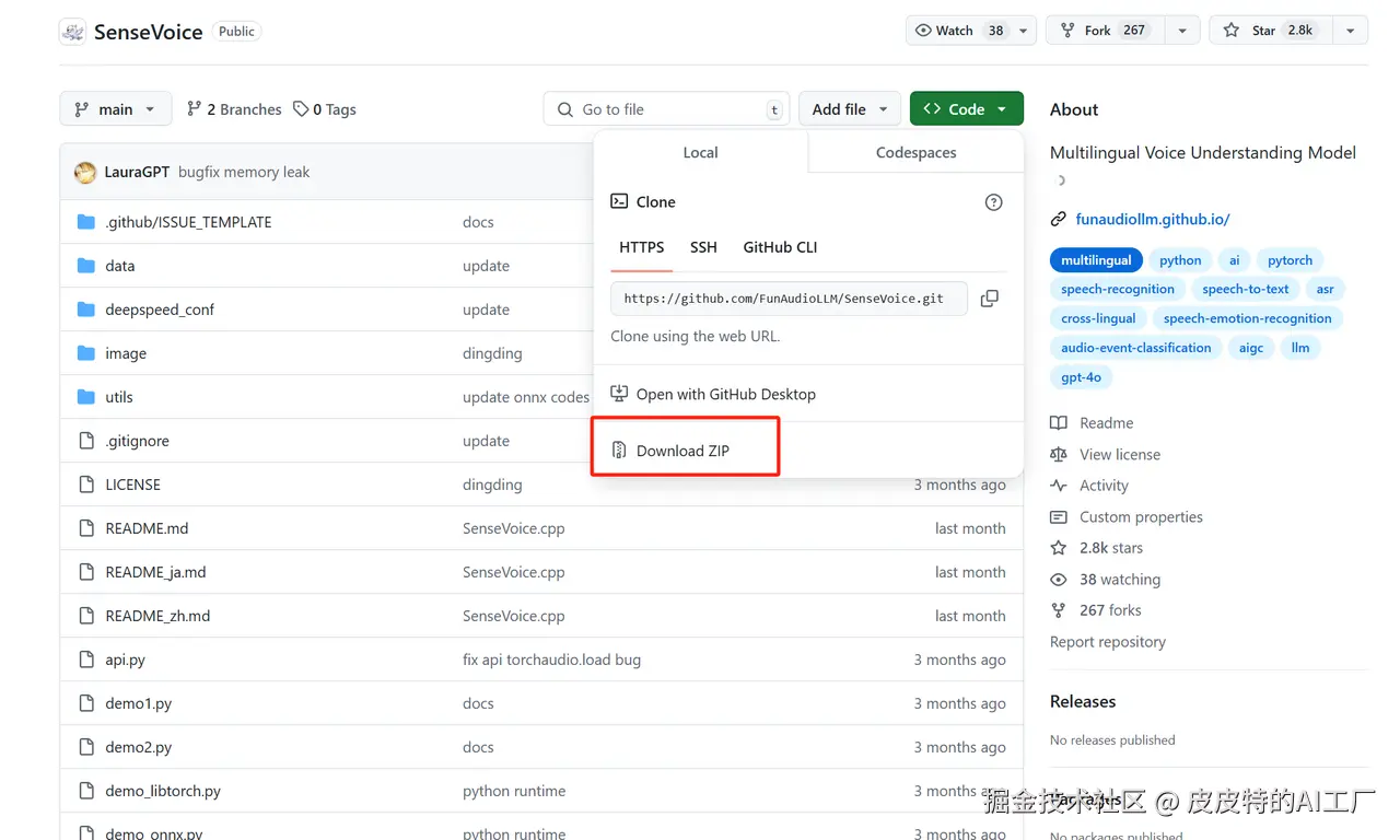 sensevoice 安装相比会比较麻烦一些,首先我们进入到项目地址 github.com/FunAudioLLM…