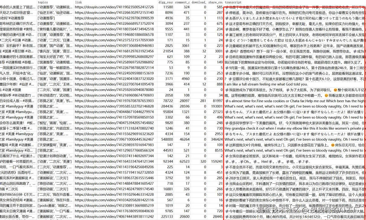 随后开启了五个线程进行转录,一千条左右的视频大概花费40分钟左右,GPU始终没有超过60%,大家可以双击看到下面的转录文本,sensevoice会识别情绪和音乐,使用emoji进行标识,转录速度和准确率相对是比较均衡的,后面可以使用AI再次对这些文案进行优化和重写。总体效果达到预期。