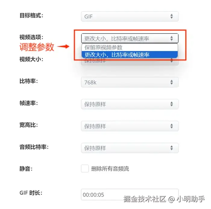 第四步:如果想要调整比特率等参数的话,点击【视频选项】旁边的选项,选择【更改大小,比特率或帧速率】,进行参数调整。