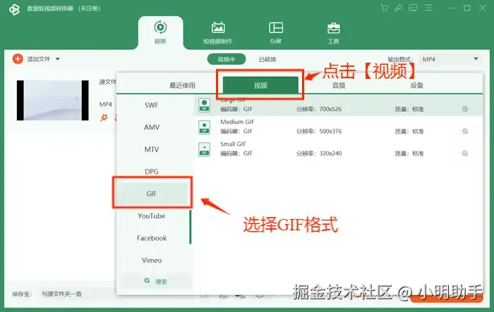 第四步:点击弹窗上方的【视频】,在列表里找到【GIF】格式并选择。