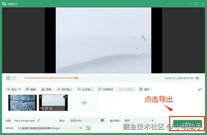 第七步:调整好所有参数和视频细节之后,点击右下方的【导出】,视频合并就完成啦。