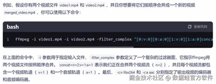 缺点:ffmpeg使用教程比较复杂,对初学者不友好。ffmpeg不提供图形用户界面(GUI),用户无法通过直观的拖放或点击操作来合并视频,只能需要手动编辑命令行参数。