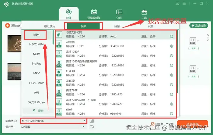 第二步: 先勾选 【合并为一个文件】 ,完成合并视频的设置。随后开始设置转码后的设置,点击 【输出设置】 ,选择 【视频】→【mp4】 ,自行选择输出质量。