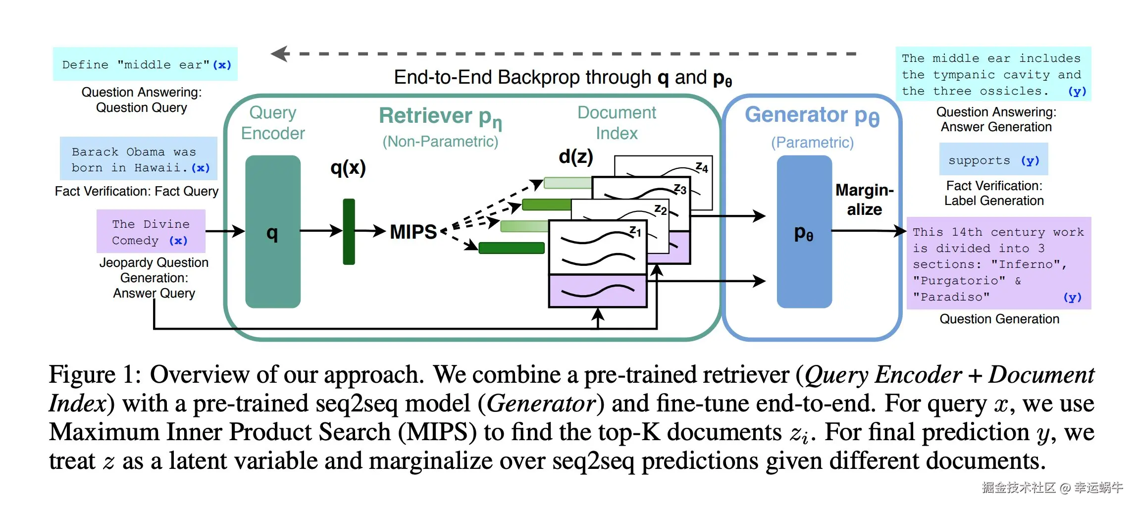 - 方法概述: 该方法结合了预训练的检索器(查询编码器+文档索引)和预训练的seq2seq模型(生成器),并进行端到端的微调。对于查询x,使用MIPS找到top-K相关文档zi。在最终预测y时,将z视为潜在变量,并对不同文档的seq2seq预测进行边缘化。