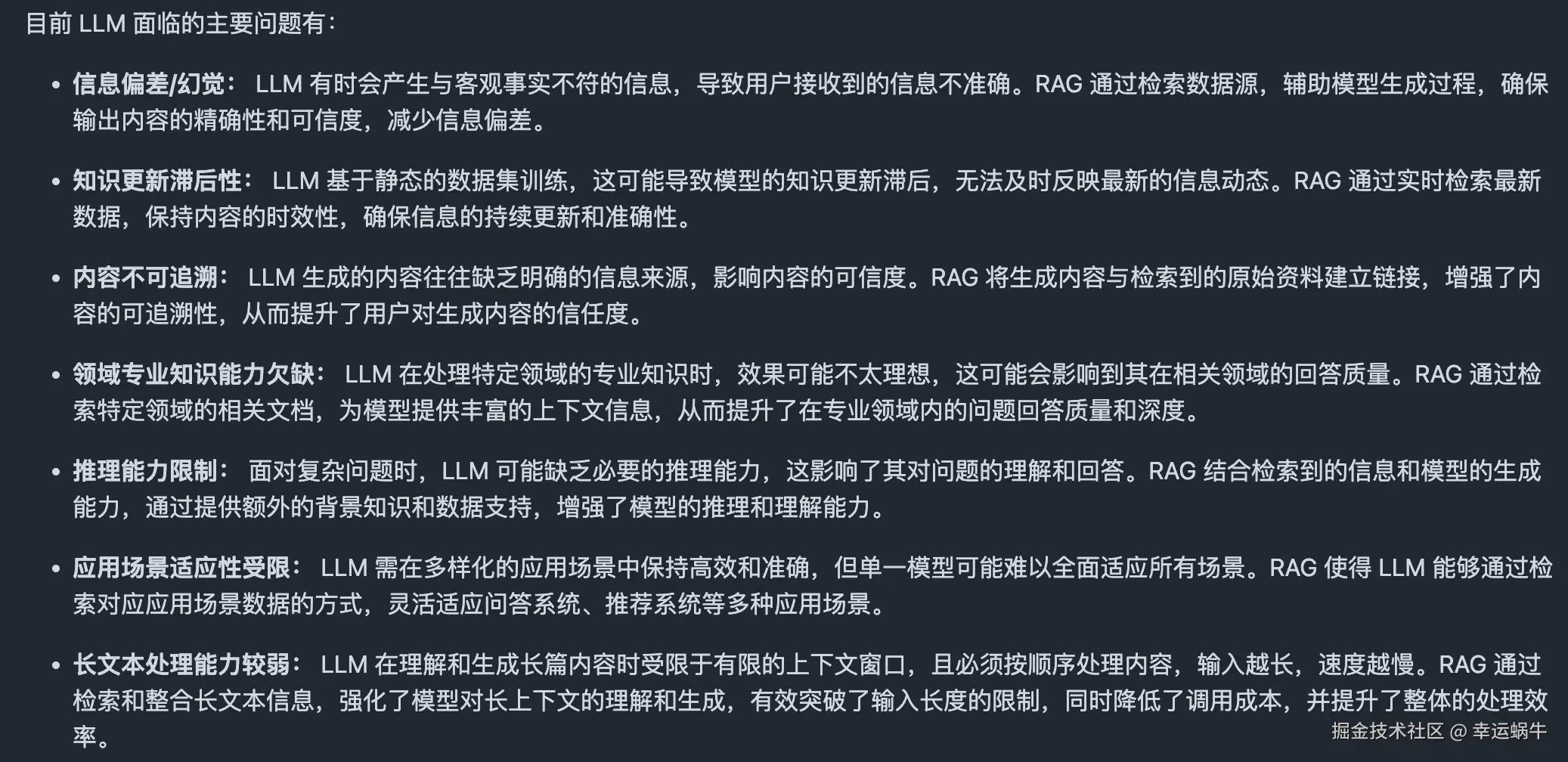 于是就有了 RAG,它利用预训练模型能够学习理解新的知识的能力,通过在 prompt 输入需要的新知识来实现更加可靠的回复,最后我们来看一下 LLM 目前的问题,