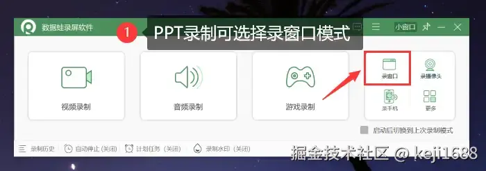 步骤1:启动软件进入主界面我们可以看到多种录制模式,录制微课推荐使用【录窗口】模式。