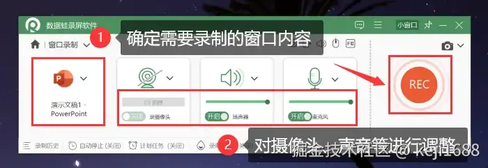 步骤2:在录窗口模式中,确定好需要录制的窗口,根据需求对摄像头和声音等进行调整。设置完成后就可以点击录制按钮 【REC】 进行录制。