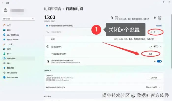 1.在 【日期和时间设置】 窗口中,关闭 【自动设置时间】 选项;