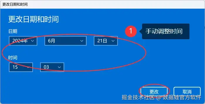 2.点击下方的 【手动设置日期和时间】 按钮,然后手动调整日期和时间;