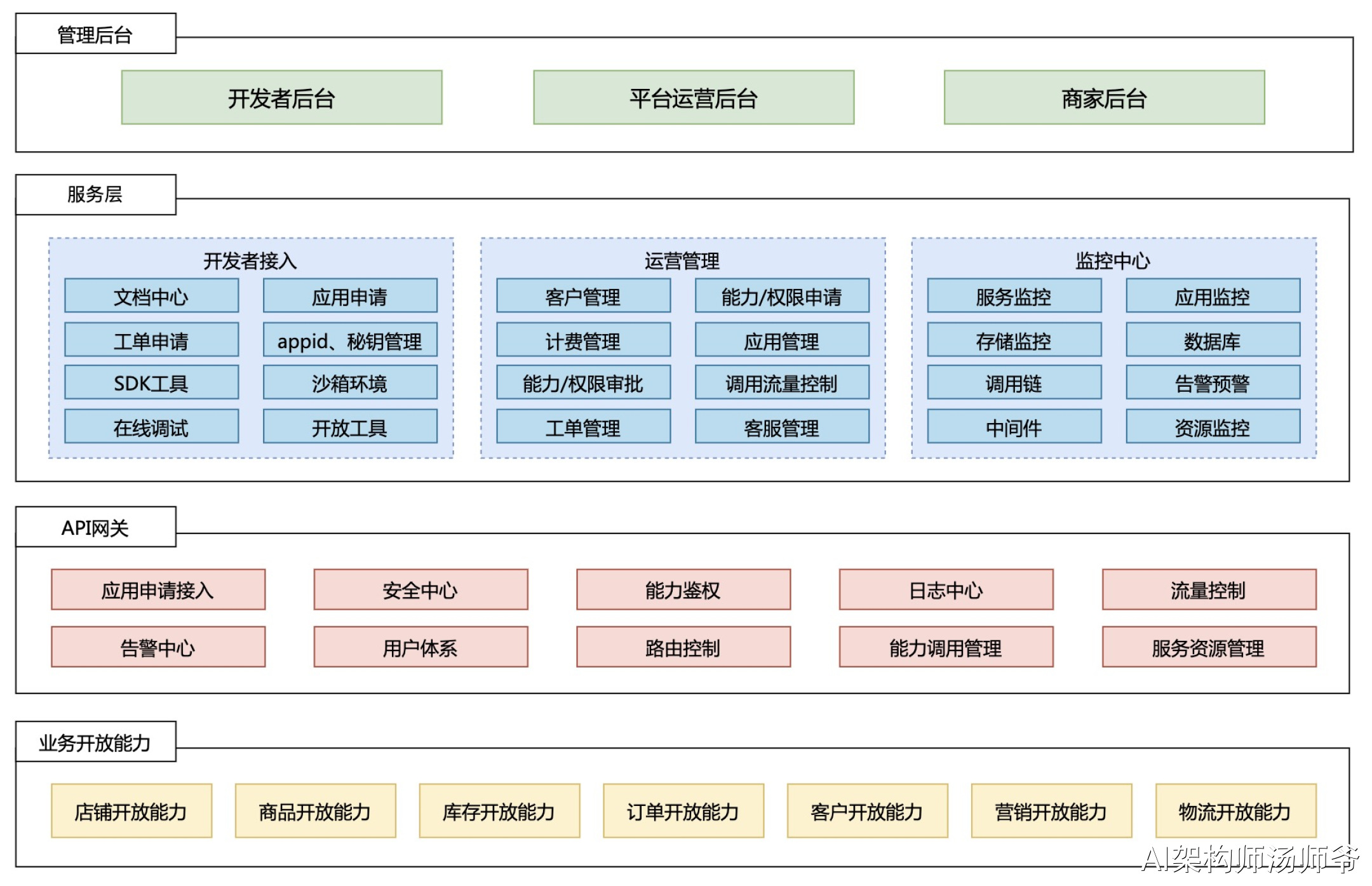 - 监控中心:包括服务器、应用、网络、数据库、安全、中间件和存储监控。这些功能确保开放平台的稳定性、性能和安全,通过实时监控、告警支持技术团队进行有效管理和维护。