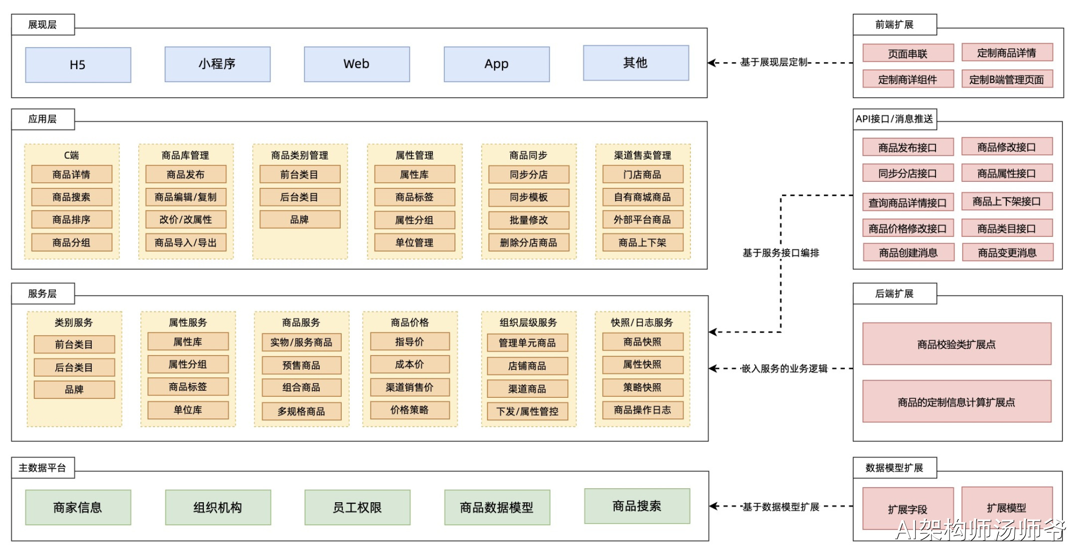 - 后端扩展:商品校验类扩展点(例如,商品创建时,校验商品编码是否符合定制需求的规范)、商品的定制信息计算扩展点(例如,通过外部接口计算出商品重量信息)。