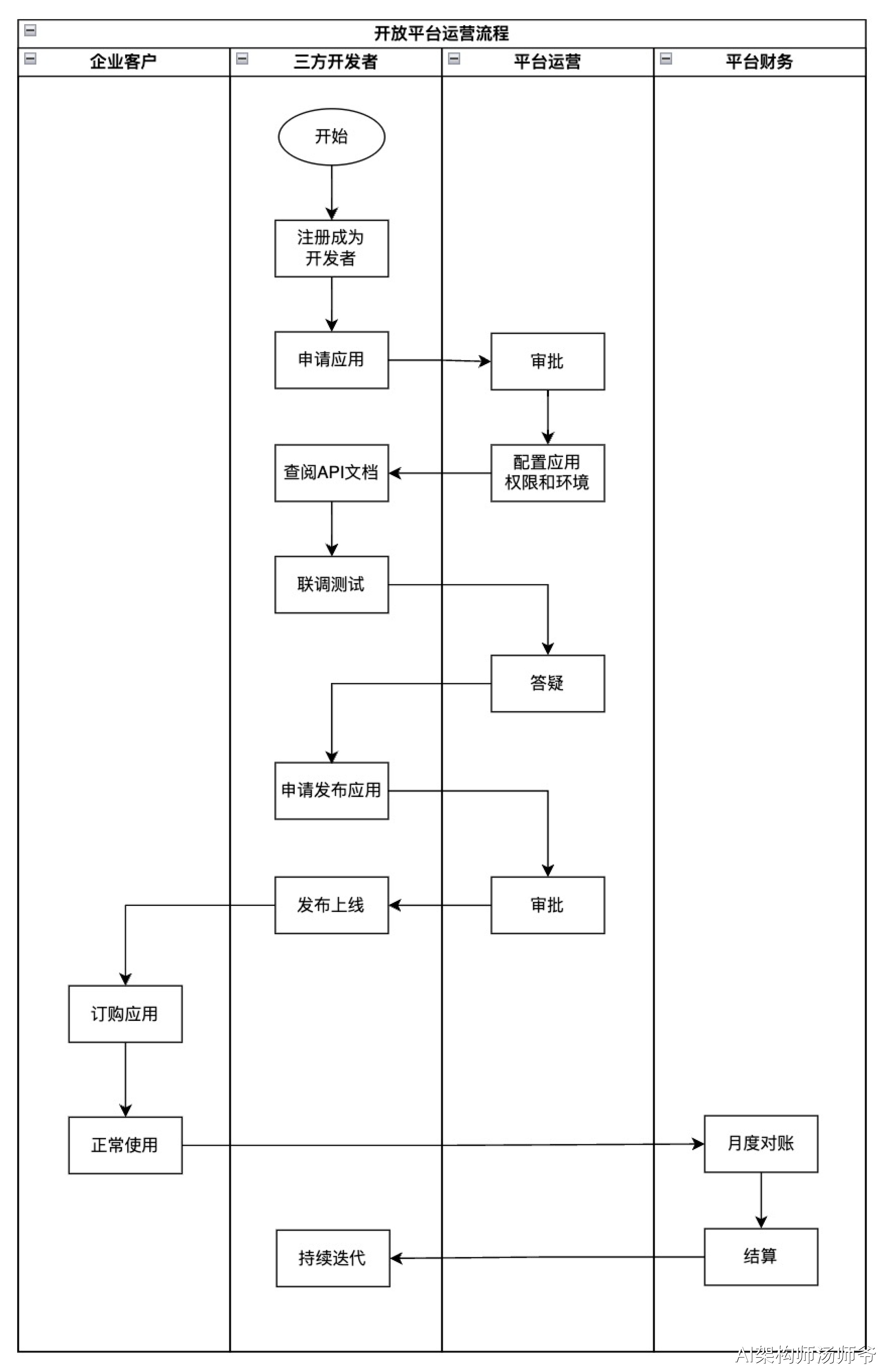 下图展示了开放平台的整体运营流程,实际的开放平台项目可以基于该流程做变更。