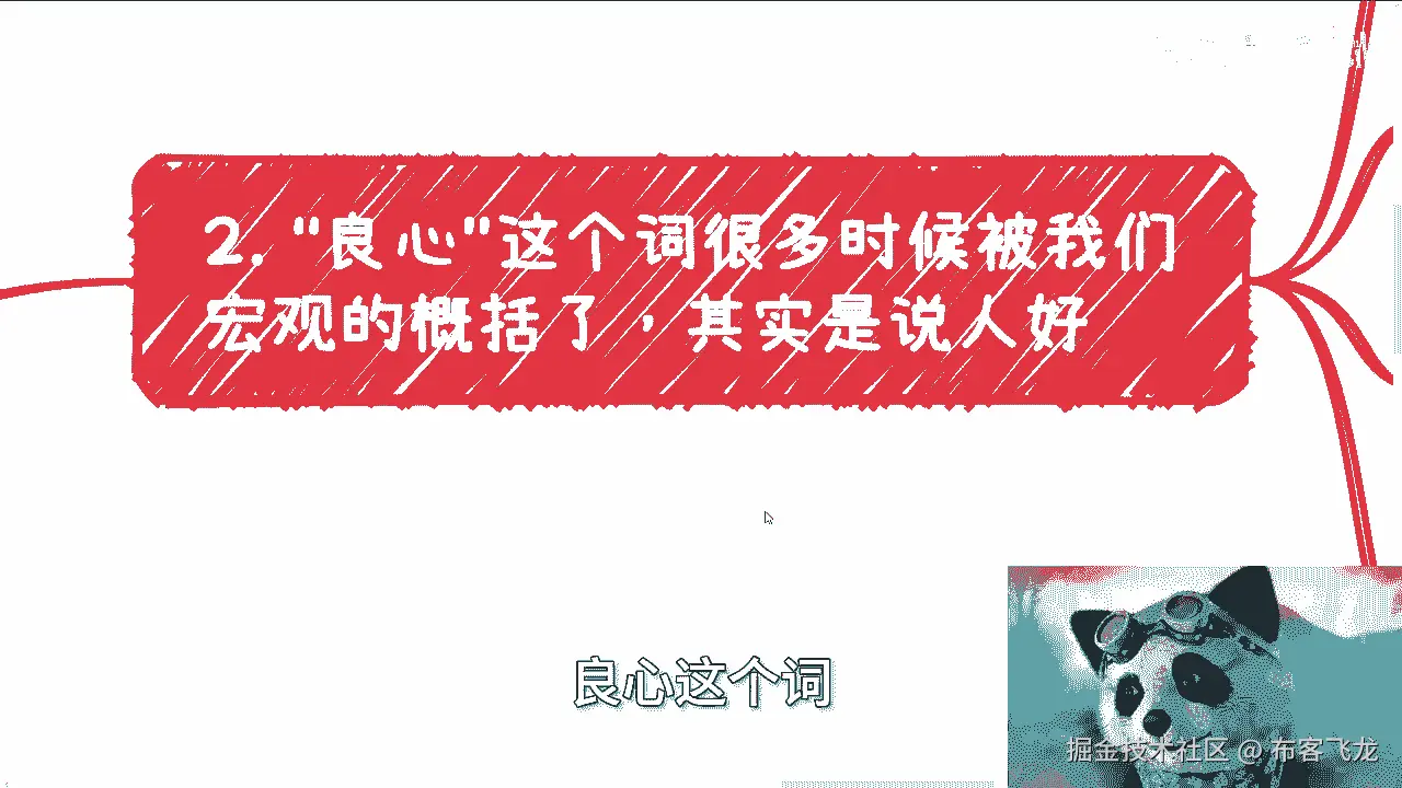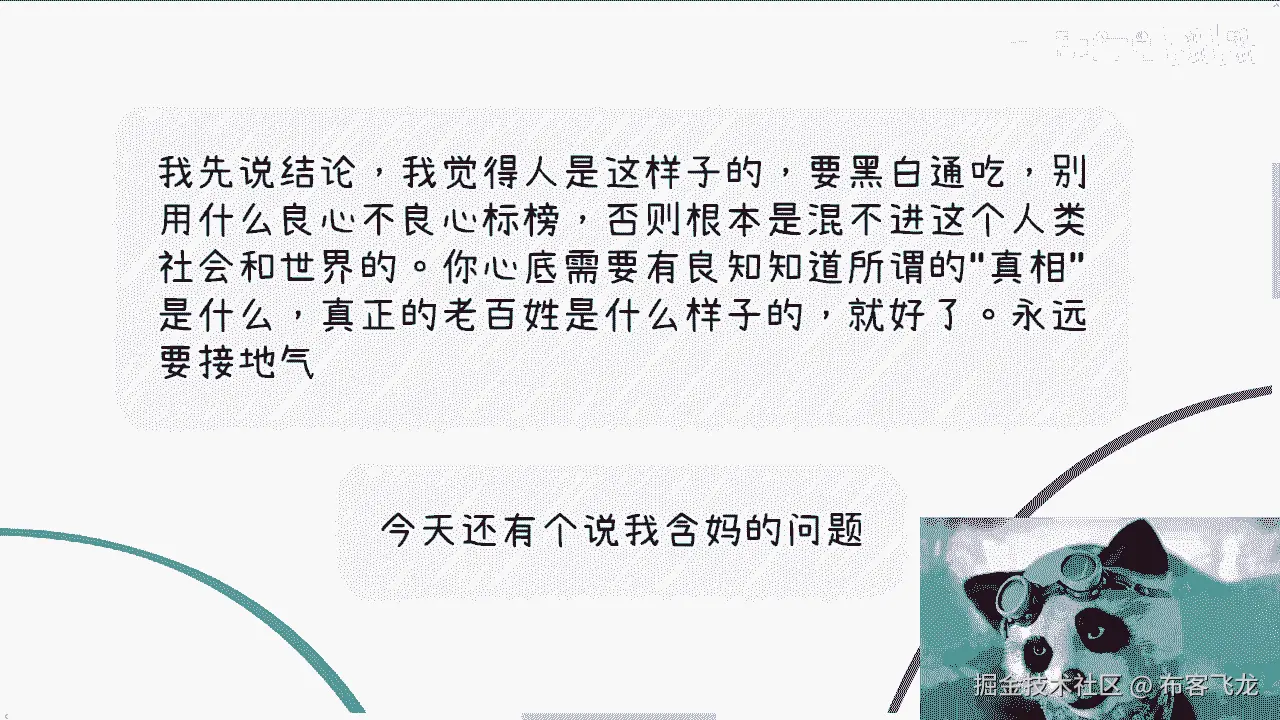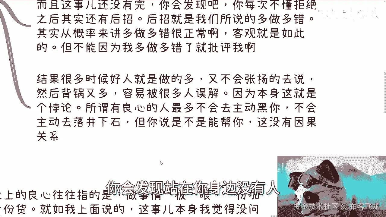 就代表我可能还那么有保有保有我的初心,跟保有我的良心,对不对,但是同样的我也不是那么有良心,我但凡是一个非常情怀化,有良心的人,那我早就被这个社会弄死了对吧,我也活不到今天,可能早就抑郁症。