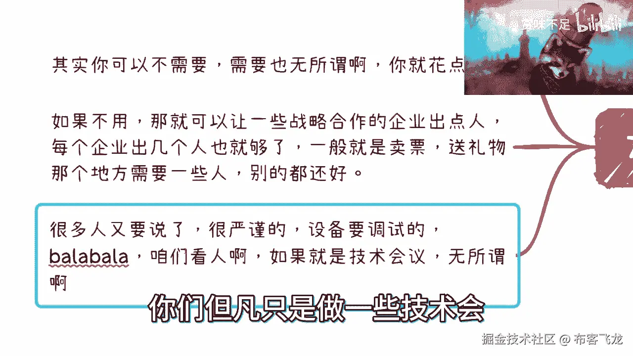 我也给技术人员办过,我什么人我都办过对吧,不同的人你办会的逻辑是不一样的啊,我跟你说,你不要说他妈的流程啊,每个人站在什么地方,几厘米我都要给他算清楚的,我跟你说啊对吧。