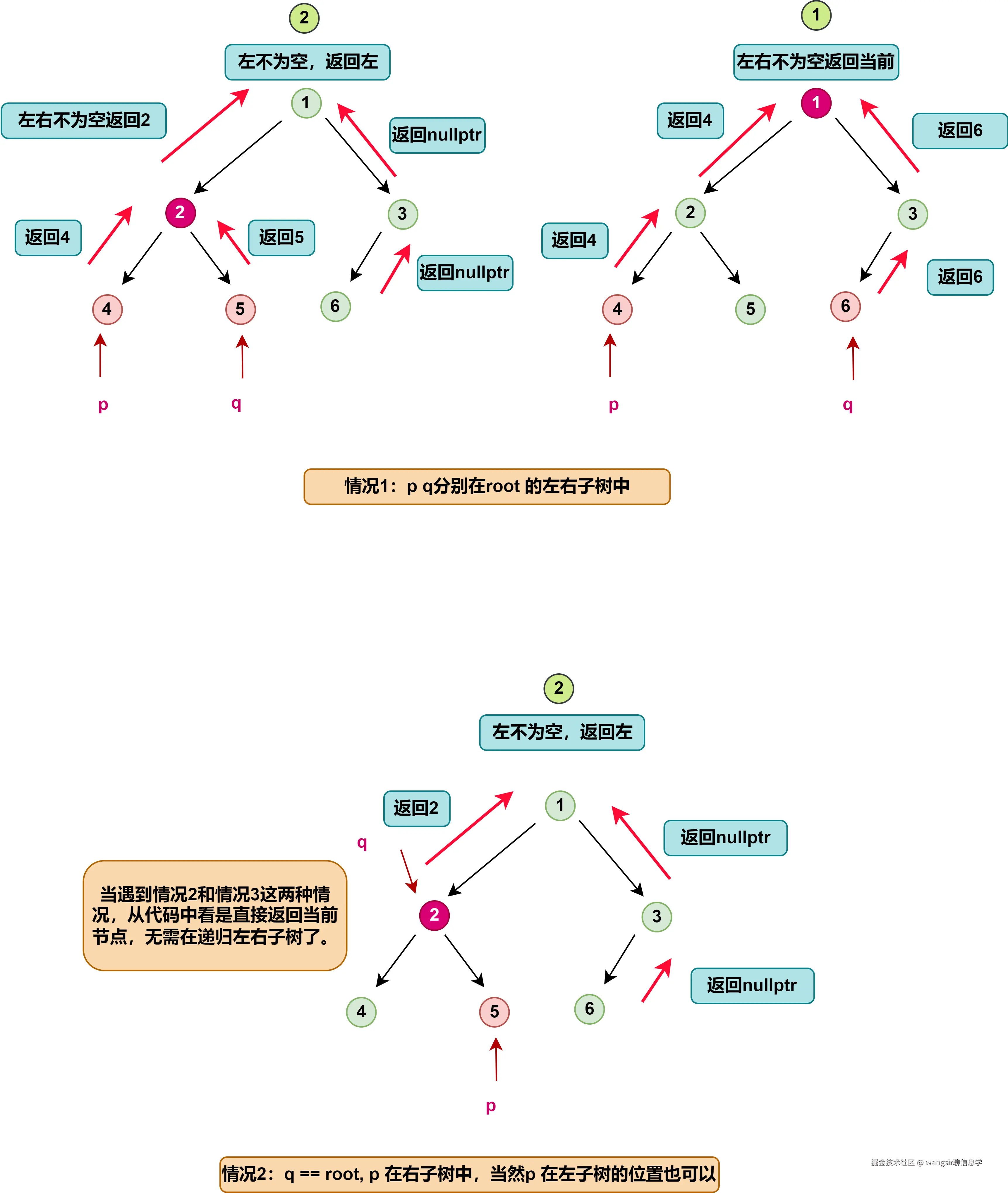 p和q找到就返回p或q,找不到返回nullptr - 如果左子树返回不为