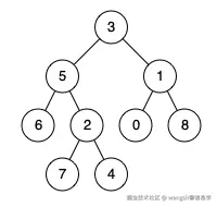 输入:root = [3,5,1,6,2,0,8,null,null,7,4], p = 5, q = 1