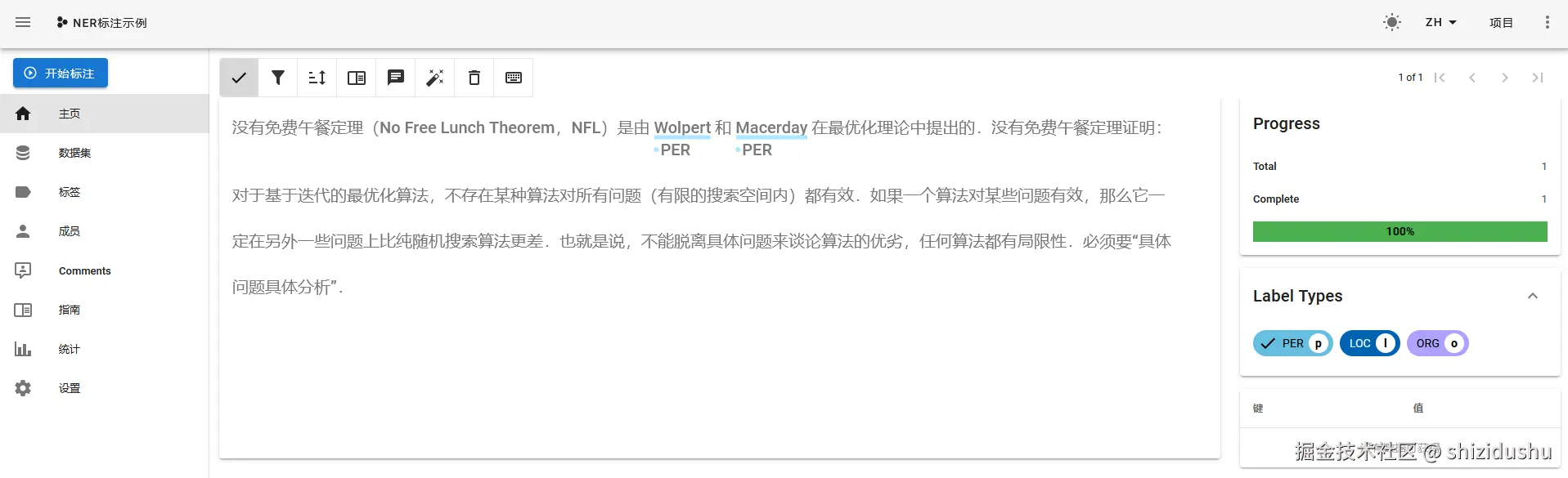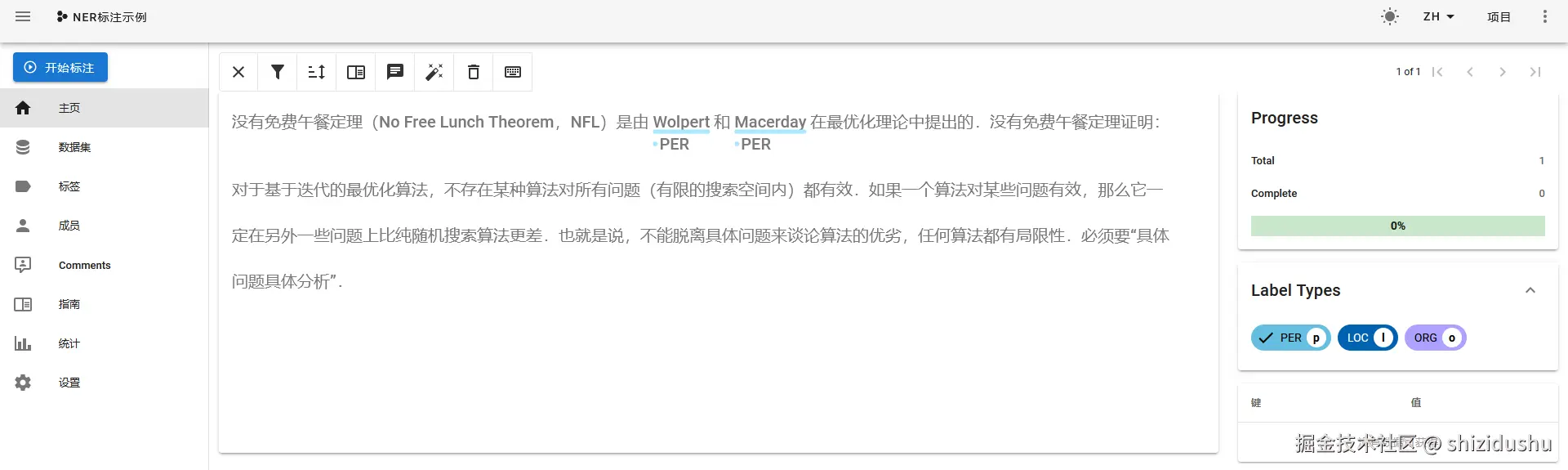 举例来说,点击右侧的PER标签,然后鼠标分别选择文本中的对应文字:
