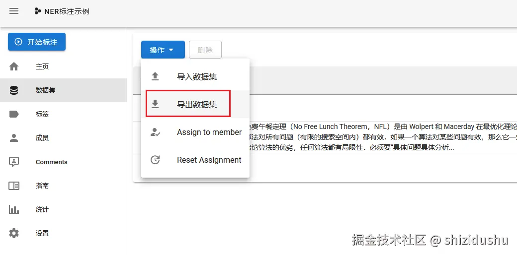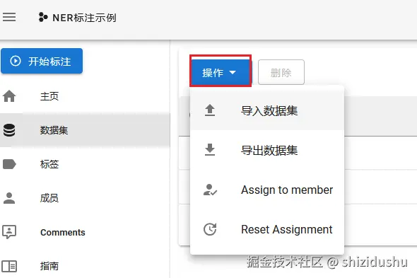 点击左侧数据集按钮,移动鼠标到操作菜单,点击导出数据集: