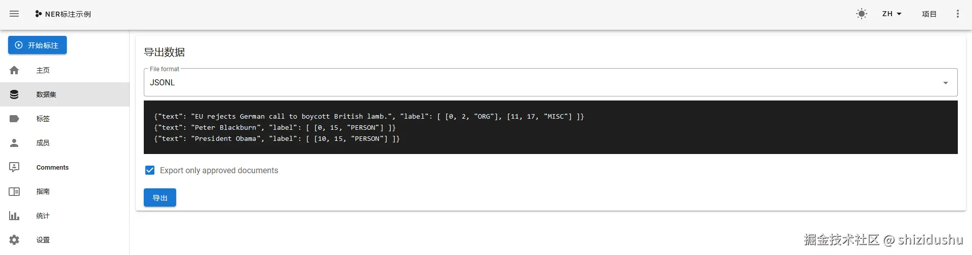 选择JSONL格式,勾选Export only approved documents(仅导出已审核过的数据),然后点击导出: