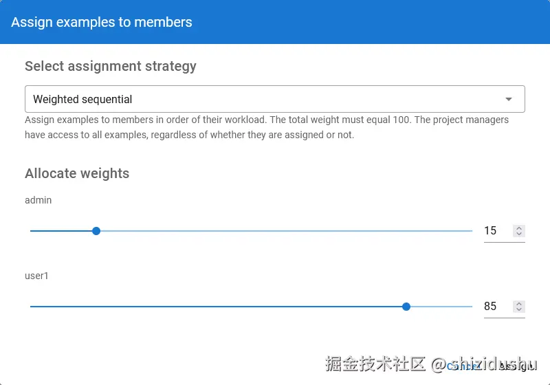 以上分配方案将15%的任务分配给admin用户,85%的任务分配给user1用户。