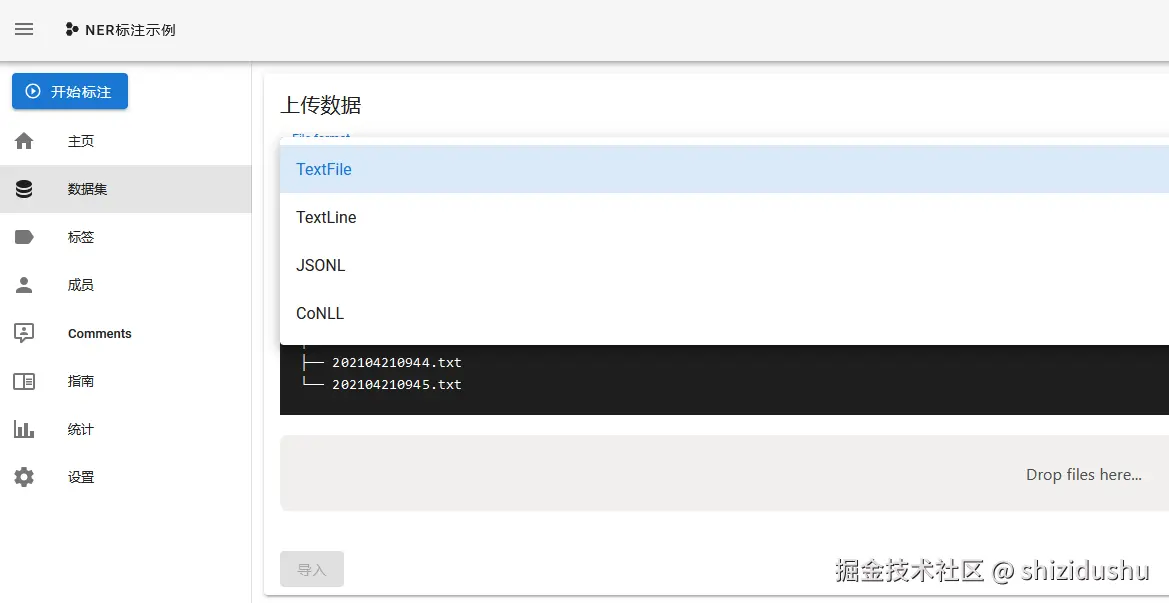 Textfile:上传的文件为txt格式,打标时一整个txt文件显示为一页内容;Textline:上传的文件为txt格式,打标时txt文件的一行文字显示为一页内容;JSONL:JSON Lines的简写,每行是一个有效的JSON值;CoNLL:CoNLL格式的文件,每行均带有一系列制表符分隔的单词;