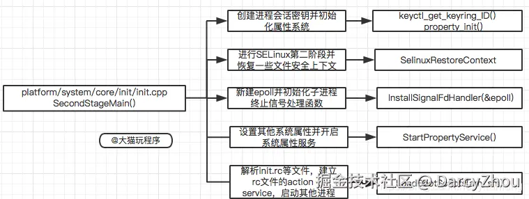 init进程第二阶段主要工作是初始化属性系统,解析SELinux的匹配规则,处理子进程终止信号,启动系统属性服务,可以说每一项都很关键,如果说第一阶段是为属性系统,SELinux做准备,那么第二阶段就是真正去把这些功能落实。