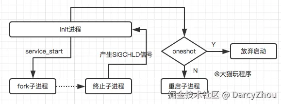 init进程启动后,首先挂载文件系统、再挂载相应的分区,启动SELinux安全策略,启动属性服务,解析rc文件,并启动相应属性服务进程,初始化epoll,依次设置signal、property、keychord这3个fd可读时相对应的回调函数。进入无线循环,用来响应各个进程的变化与重建。