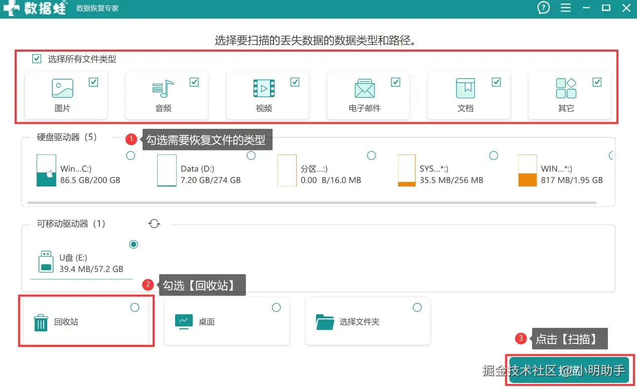 步骤1: 进入软件的主页面,然后勾选自己需要恢复的文件类型,再看向页面下方勾选上【回收站】,最后单击【扫描】。