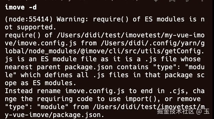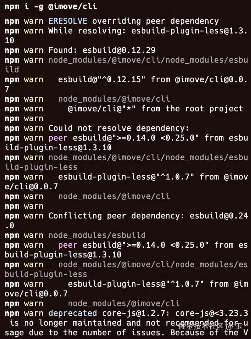 这里需要注意下,安装@imove/cli大概率会遇到失败的情况,看了下github中也有人反馈这个问题,但是目前还没有回复如何解决,当前最新的版本应该是0.0.5,如果遇到问题可以安装指定0.0.4版本,错误图下