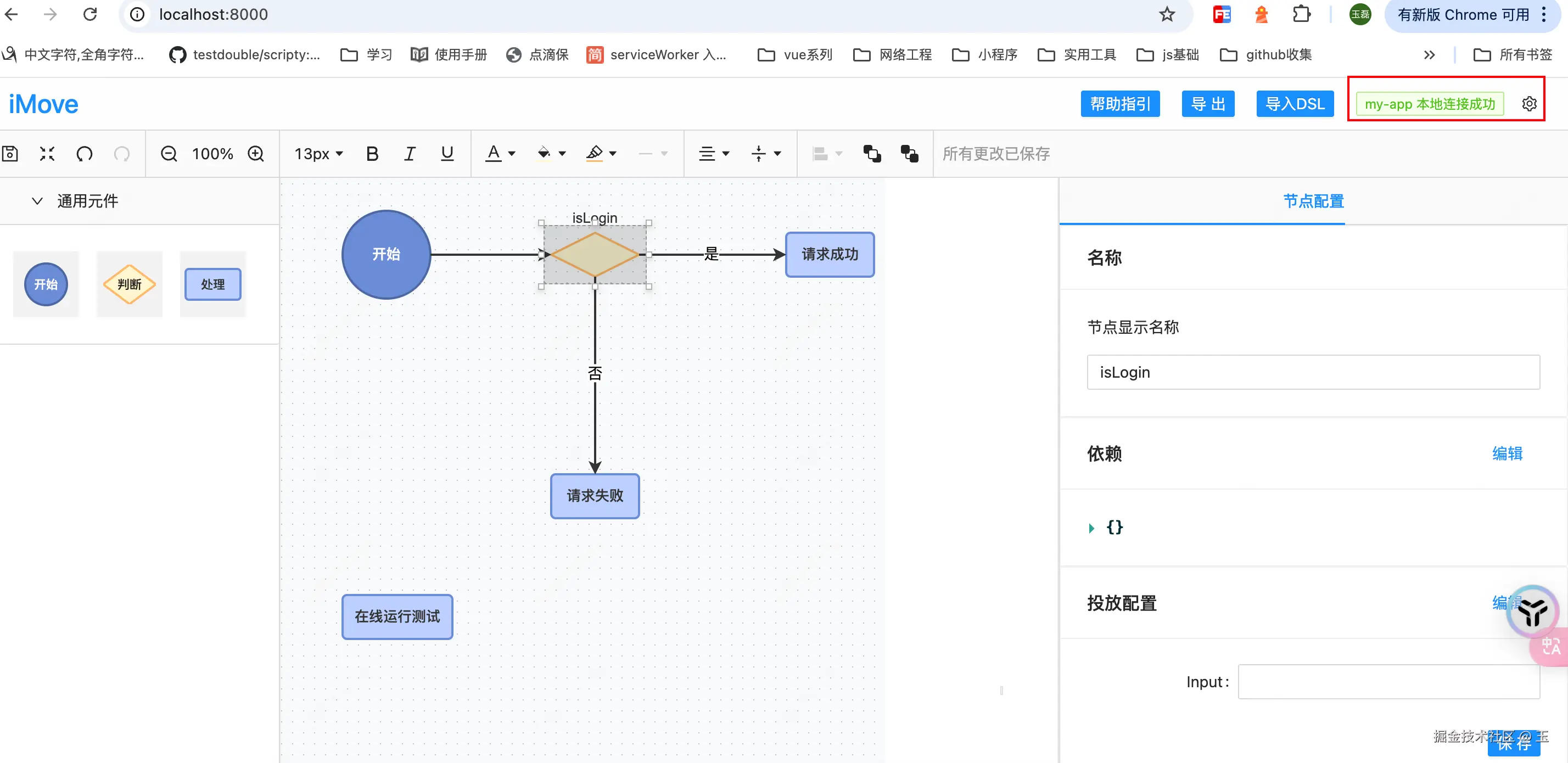 imove 是一个逻辑可复用的,面向函数的,流程可视化的 JavaScript 工具库。只要你移动鼠标拖拽,生成流程图之后配置节点 imove 会帮你生成对应代码。特性