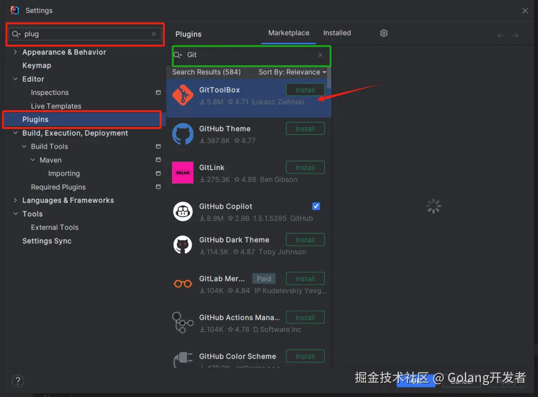 搜索Plugins栏目选项,打开插件应用市场,搜索GitToolBox,找到后点击Install进行安装。