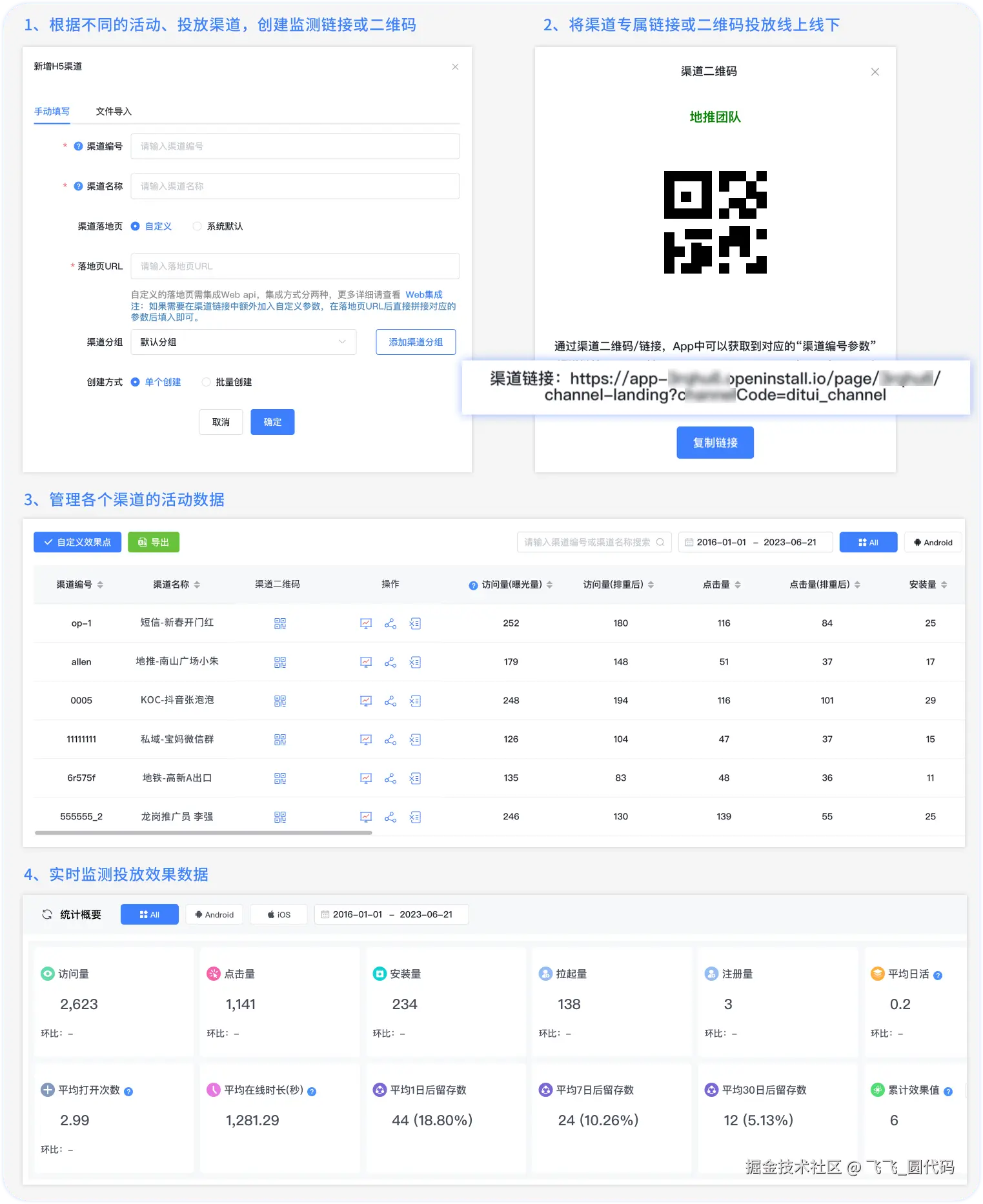 用户只要访问此URL安装App,openinstall就会实时统计其带来的访问量、点击量、安装量、注册量、活跃、留存等全链路数据,并自动生成独立渠道报表。哪怕有成百上千的推广渠道、业务场景复杂多达数百种也完全适用,只需依此方法创建海量带独立参数的链接分发投放即可,同时也免去了打多个渠道包的繁琐流程。