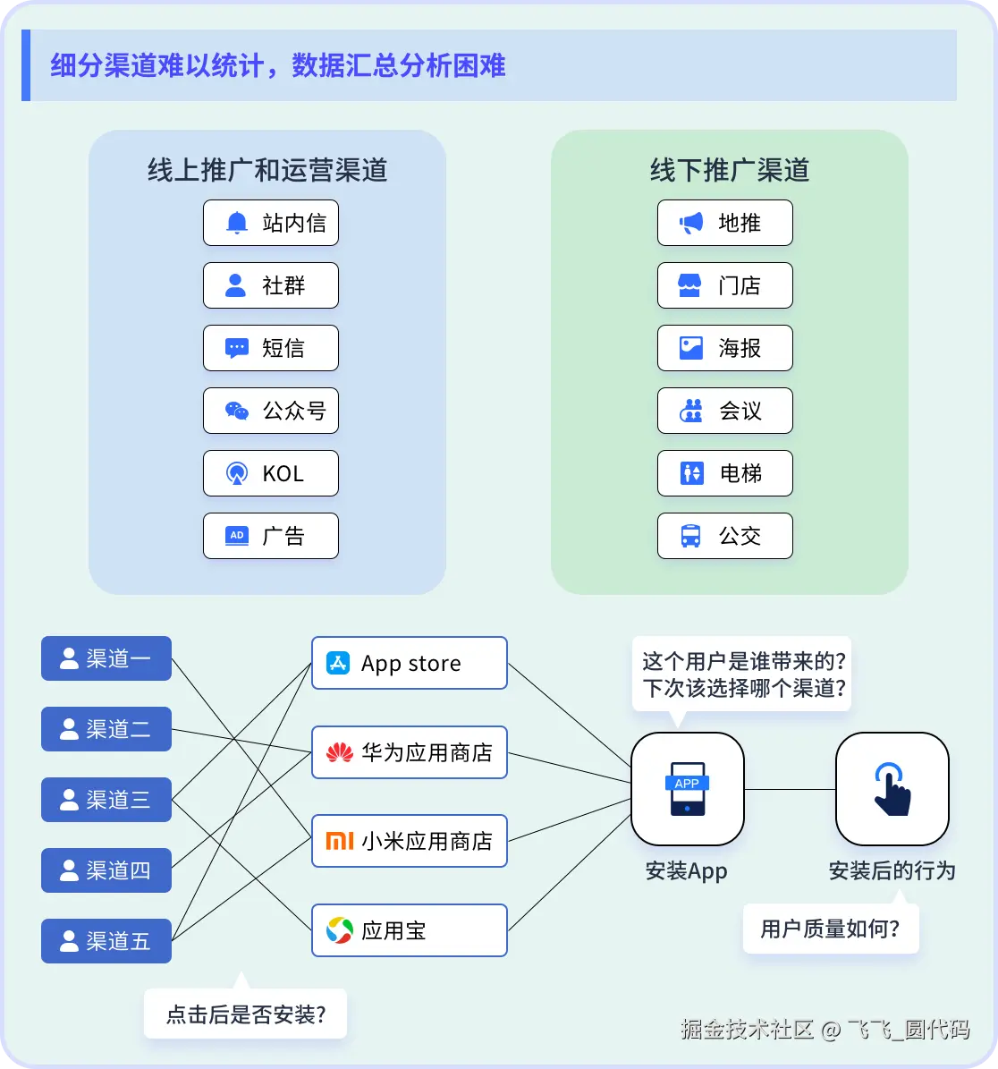 负责渠道分发的部门都需要收集区分不同安装渠道的转化量(注册、付费等数据)做数据分析,通常包括官网跳转、KOL营销、用户分享、广告投放、活动拉新等多个渠道。